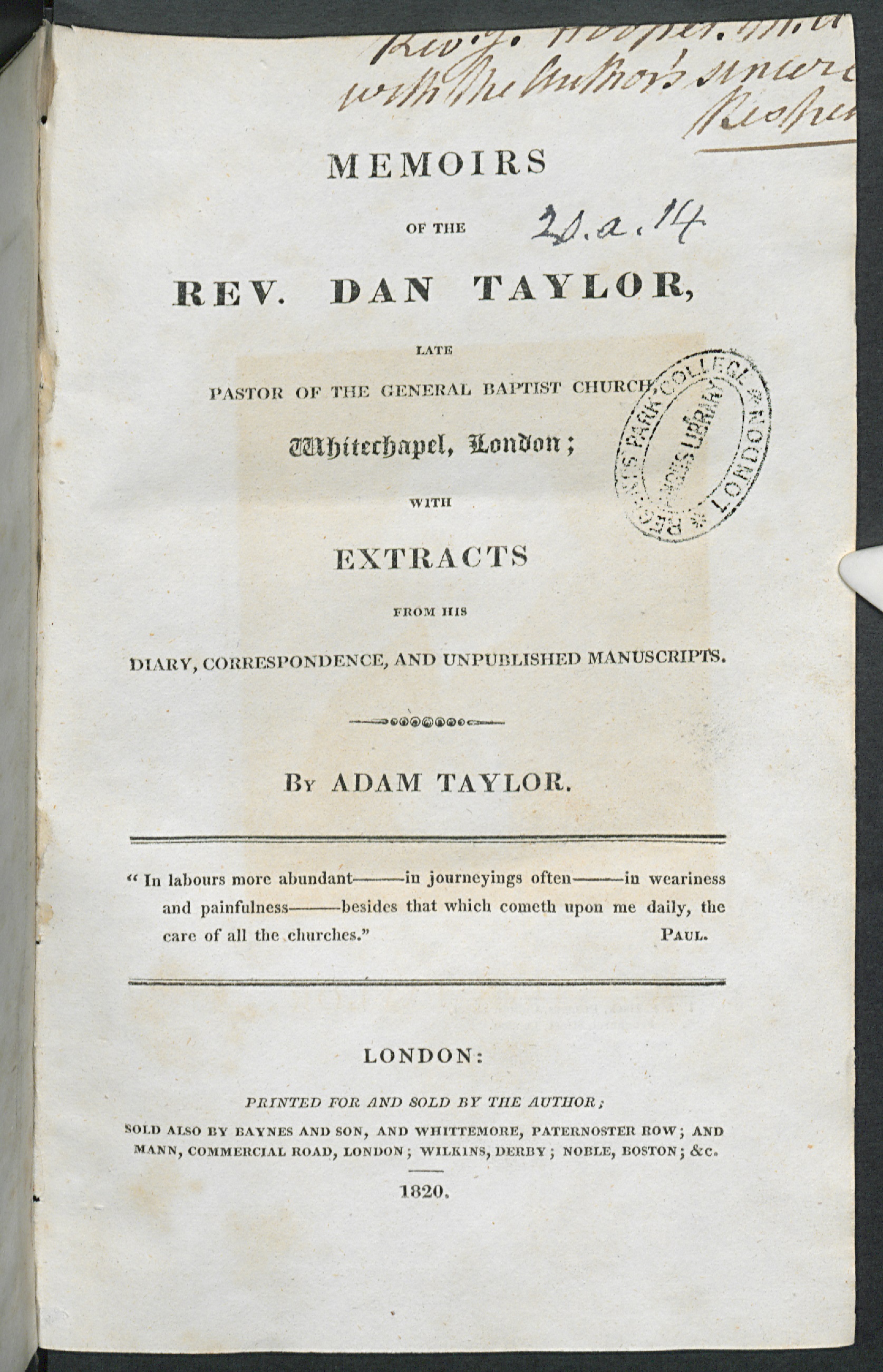London : Printed for and sold by the author, sold also by Baynes and son, and Whitemore, Paternoster Row, and Mann, Commercial Road, London ; Wilkins, Derby; Noble; Boston; &c. |