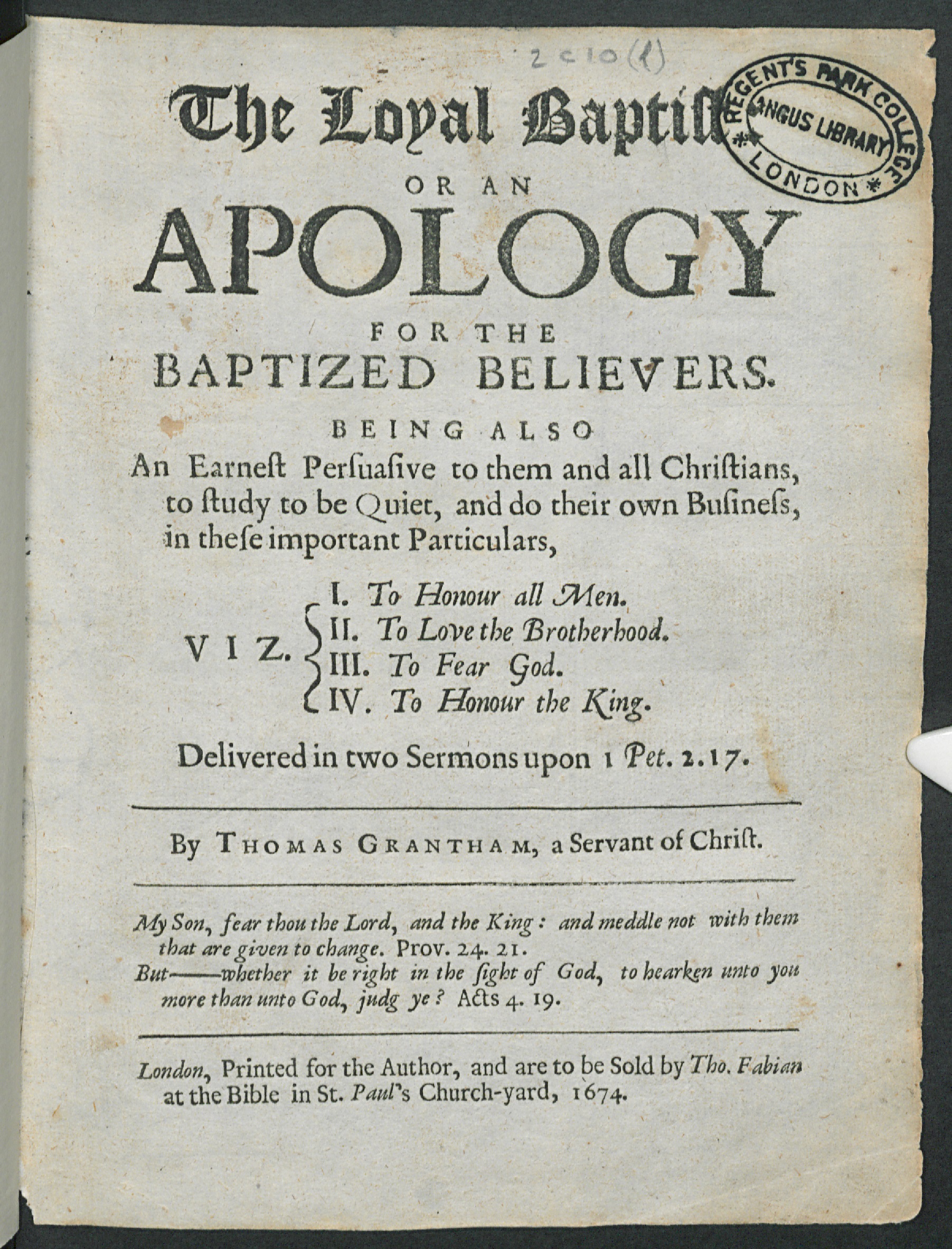 London : Printed for the Author, and are to be Sold by Tho. Fabian at the Bible in St. Paul's Chrch-yard |